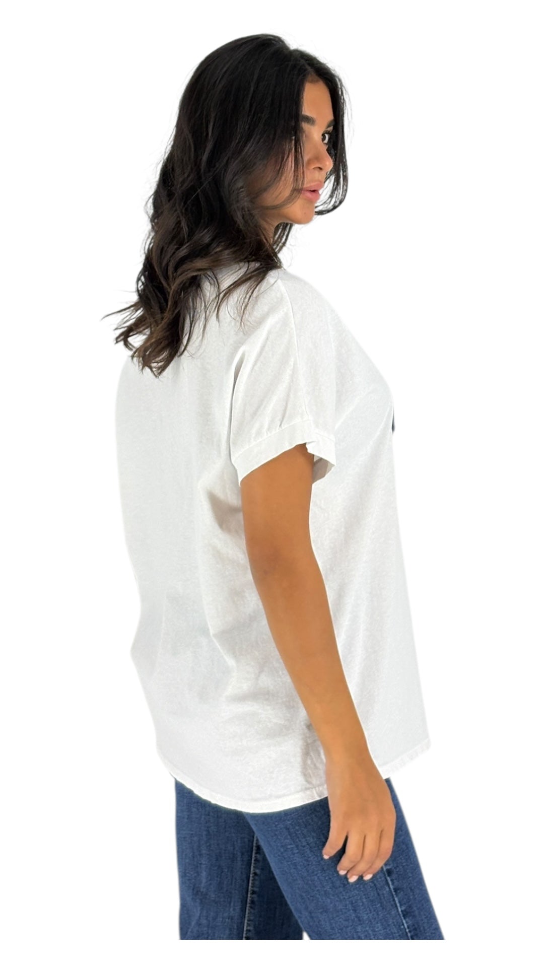 The top is a white t-shirt with "BOHEME" written on it in blue.