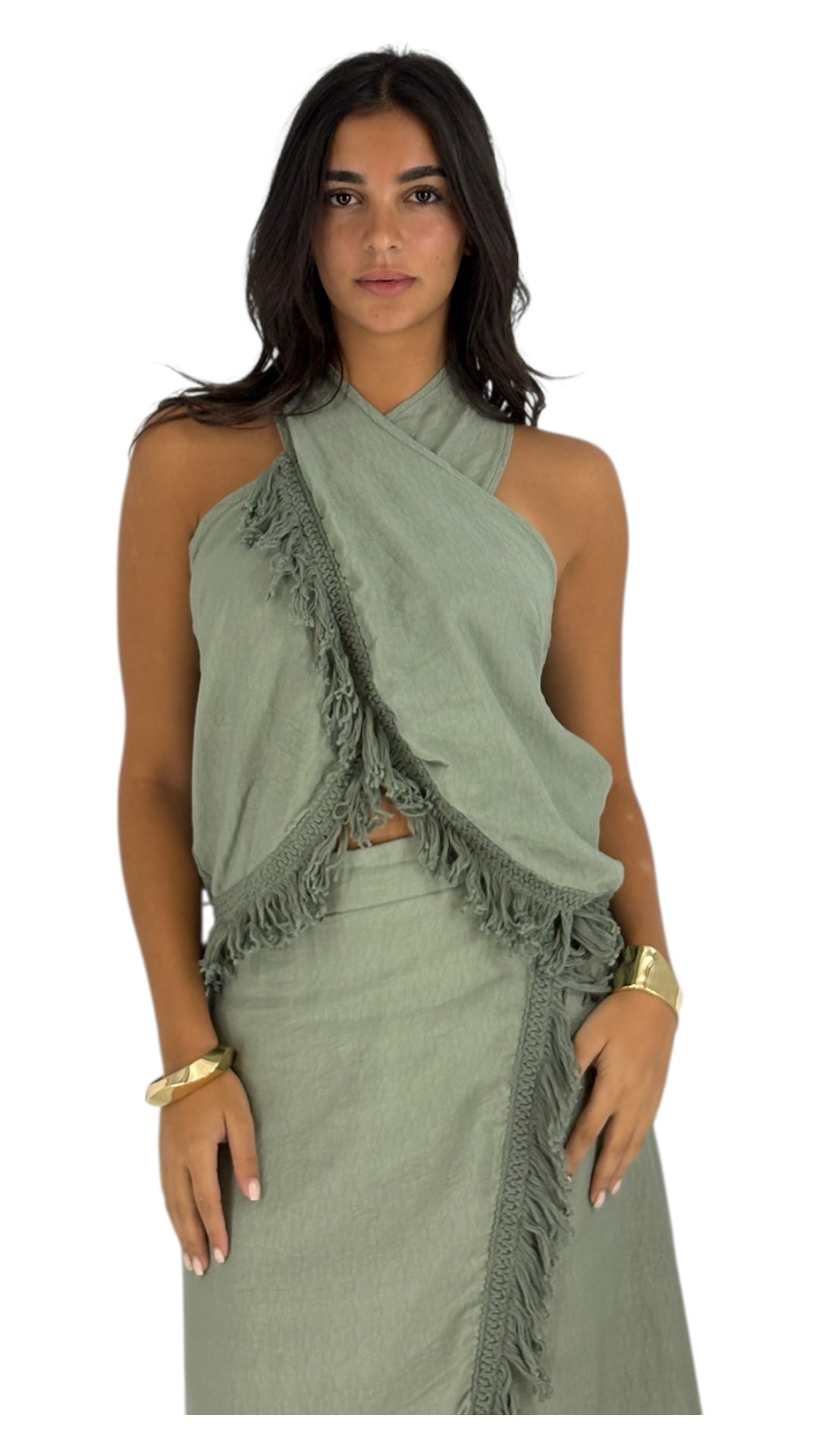 The top is light green, halter-style, and has fringe detailing at the bottom. It sounds so stylish and fun! Also it is halter-neck style in a light green color, featuring fringed detailing. The design suggests a bohemian or summery vibe, perfect for a relaxed yet stylish look.