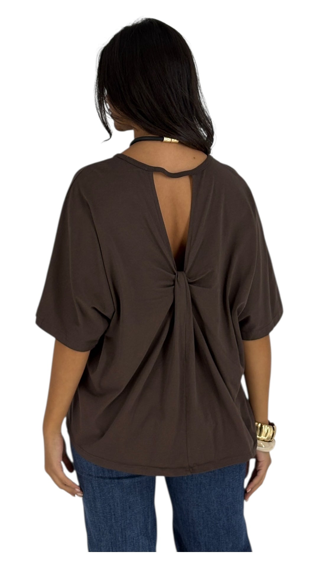 The top is brown and short-sleeved, with a unique twisted design at the back. It sounds like a stylish piece!