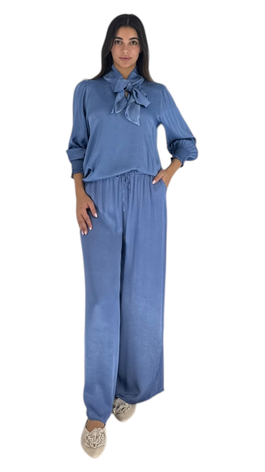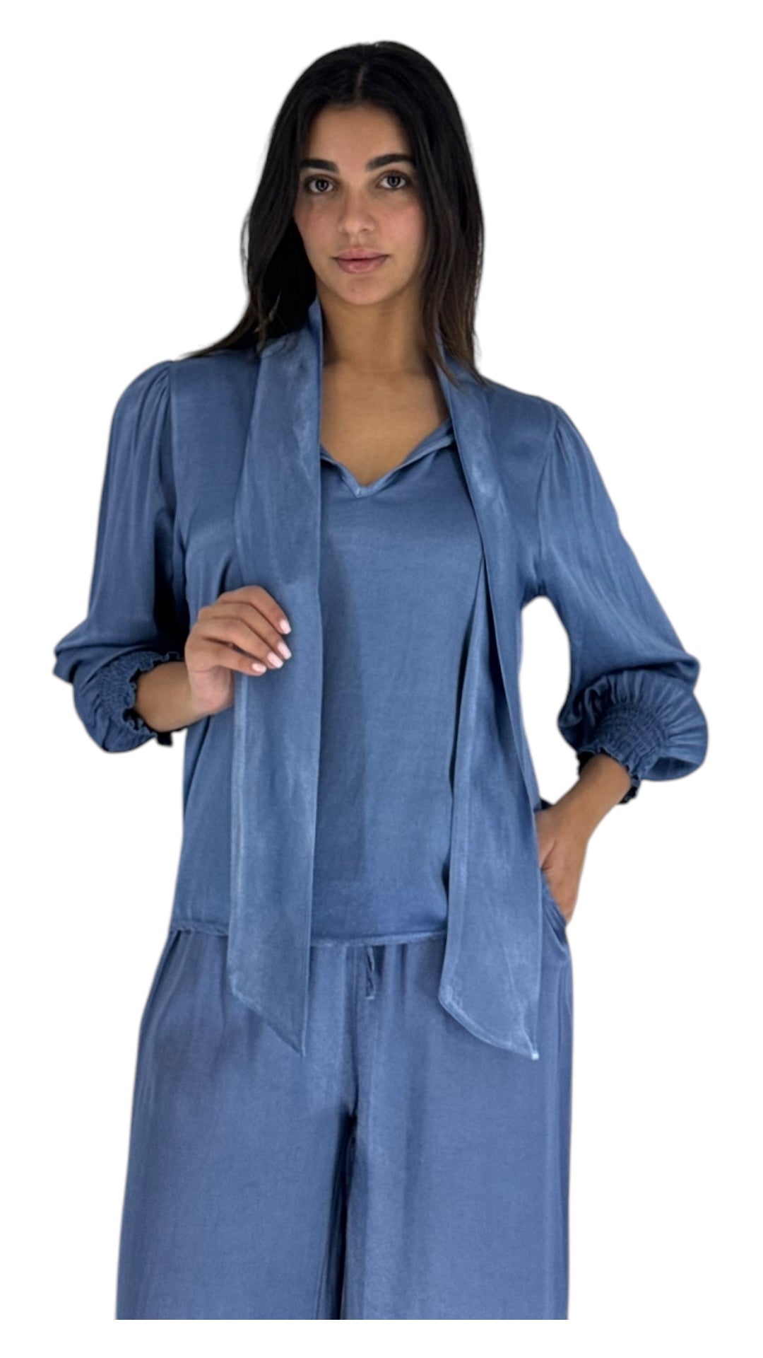 Elevate your wardrobe with our exquisite long-sleeved top. Crafted from a luxurious, silky fabric, this top drapes beautifully and feels incredibly soft against the skin. The light blue hue offers a serene and sophisticated aesthetic, perfect for any occasion. The flowing sleeves add a touch of elegance and movement, while the subtle details ensure a flattering fit.