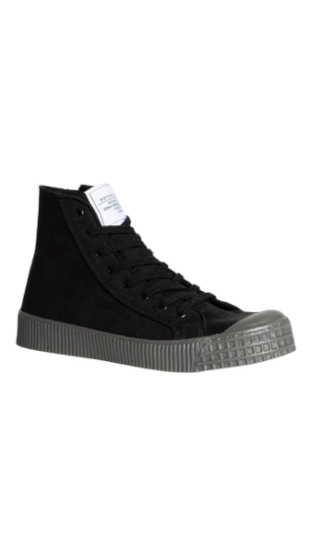The shoes are high-top sneakers with a brown suede upper, a light black sole, and white laces. They have a white tongue with a logo patch and metal eyelets. They've got a great, classic look , you could dress them up a bit with chinos or even a skirt
