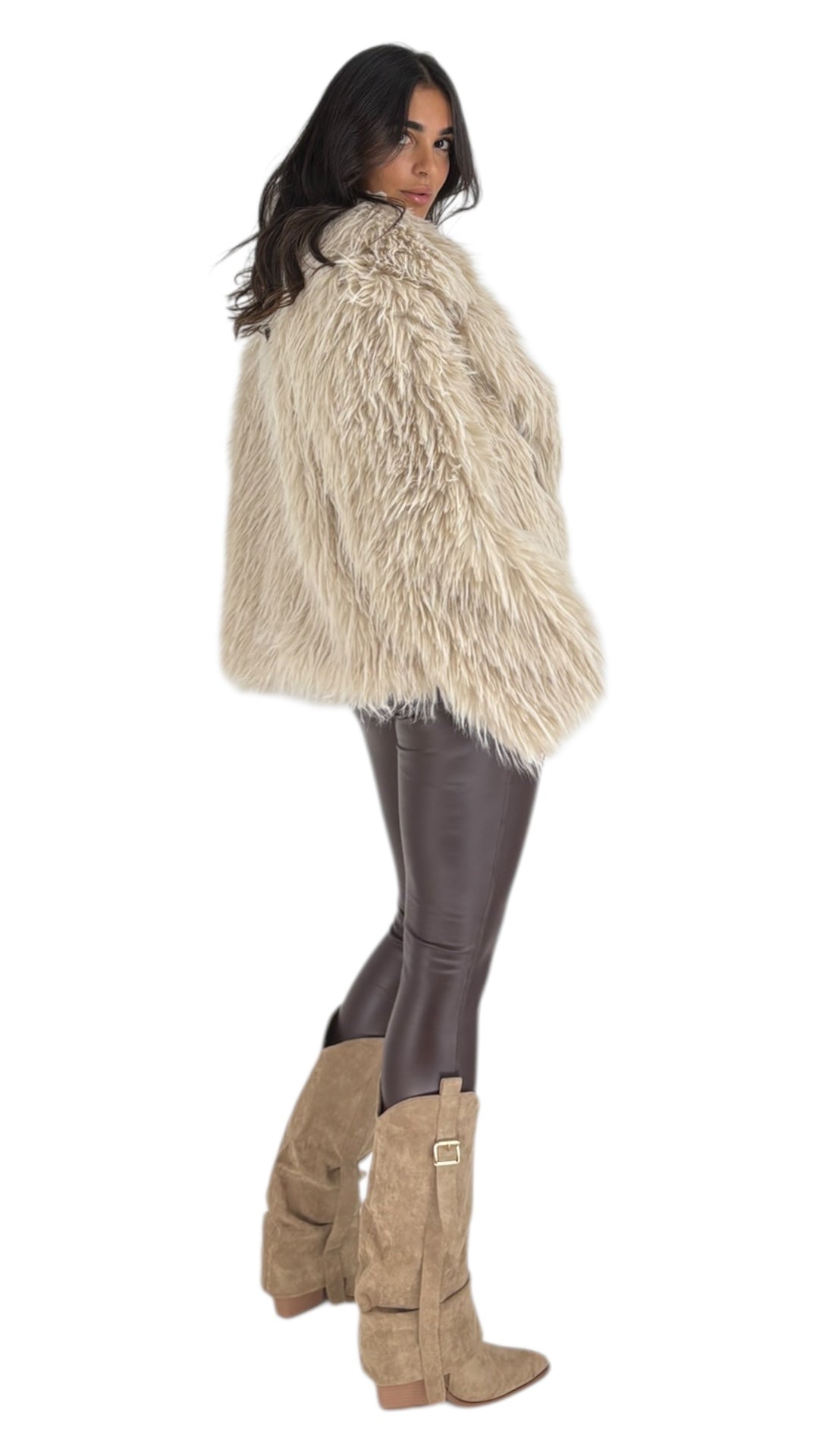 The jacket is fluffy and light-colored, possibly made of faux fur. It looks incredibly soft and inviting. The style is likely oversized, judging by the volume. It seems like a perfect piece for adding both warmth and a touch of glamour to an outfit.