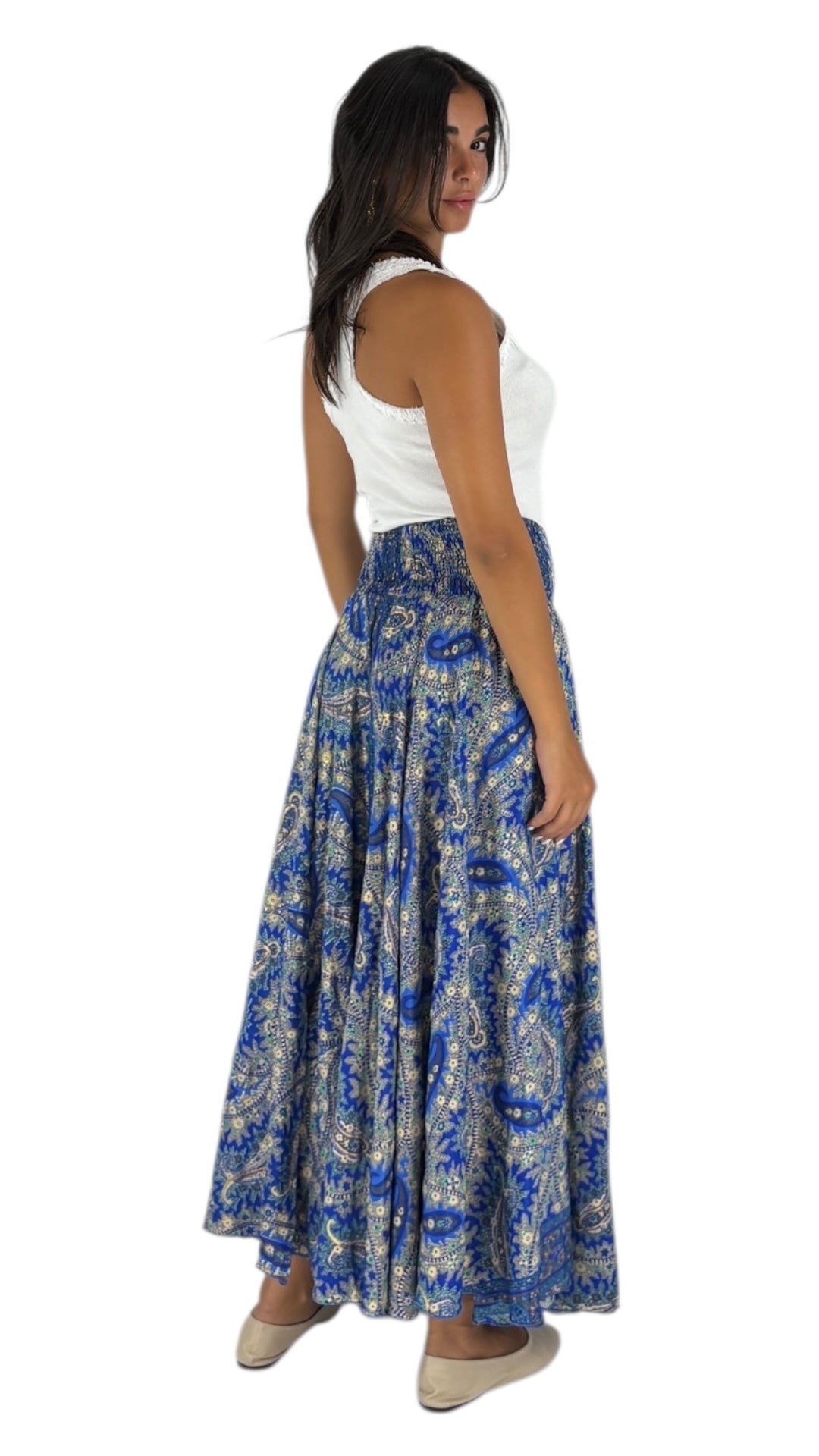 Elevate your style with these chic wide-legged blue paisley pants! The striking paisley pattern and vibrant blue color make a bold fashion statement. The wide-leg design offers a flattering and comfortable fit, while the lightweight fabric ensures all-day wearability. Pair them with a simple white tank top or a fitted blouse to complete your look. These pants are perfect for adding a touch of bohemian flair and elegance to your wardrobe!