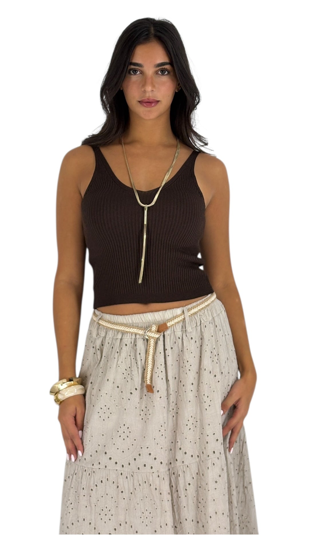 It features a flattering V-neckline and thick shoulder straps, offering both support and a sleek silhouette , The vertical ribbing creates a cozy yet slimming texture, which is a popular element in modern casual wear.The rich dark brown, espresso, or chocolate hue makes it an excellent neutral base piece for many outfits.