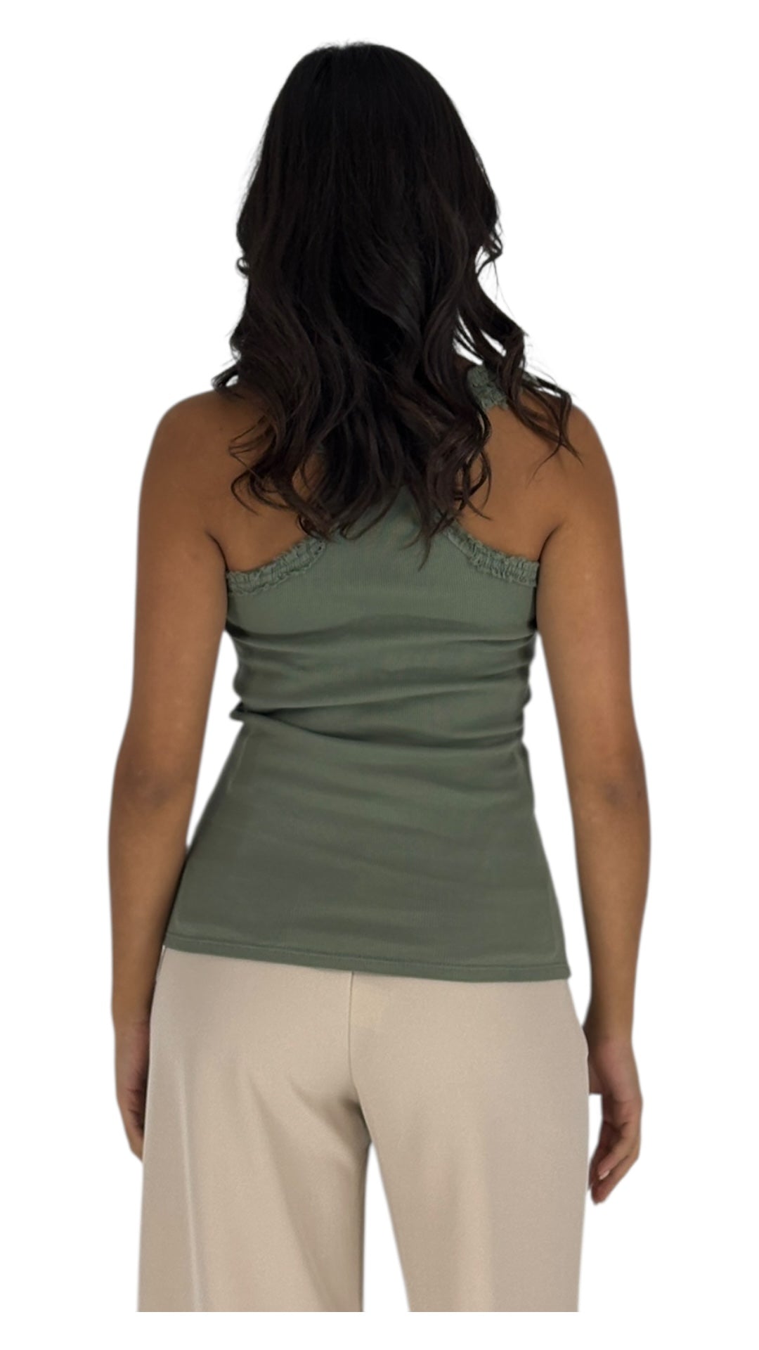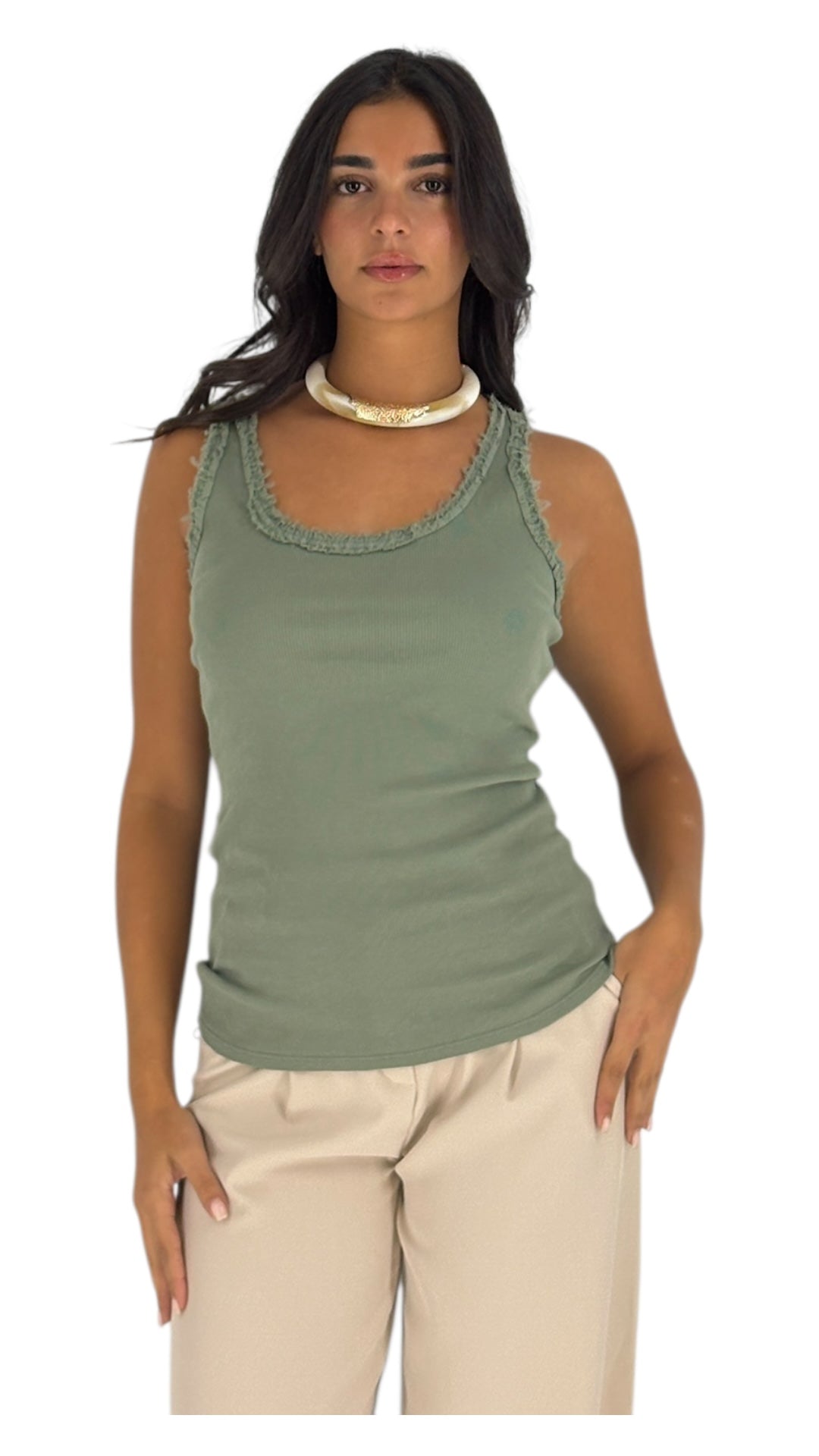 The top is kaki and sleeveless, It looks perfect for a warm day , It's versatile and could be dressed up or down , It's a great piece for many occasions!