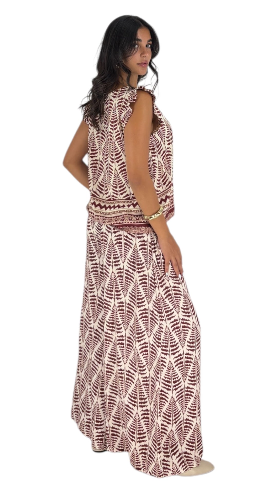 Wide-leg pants featuring an all-over print and a flowy silhouette. Designed with comfort in mind, they offer effortless movement and a flattering fit. Ideal for pairing with the matching top or a simple blouse for versatile styling.