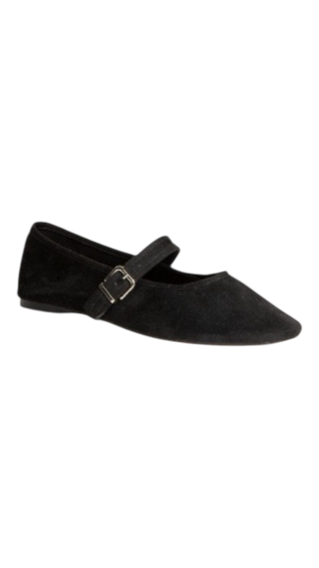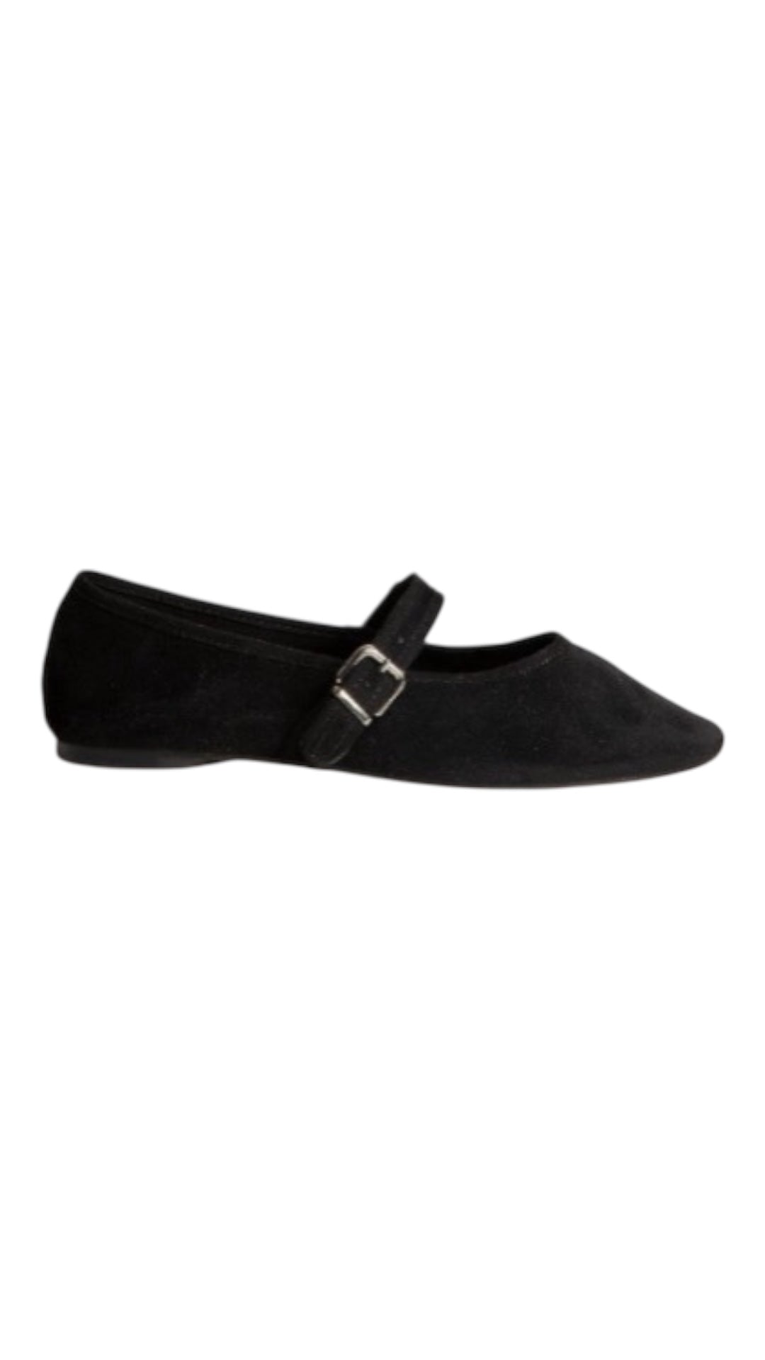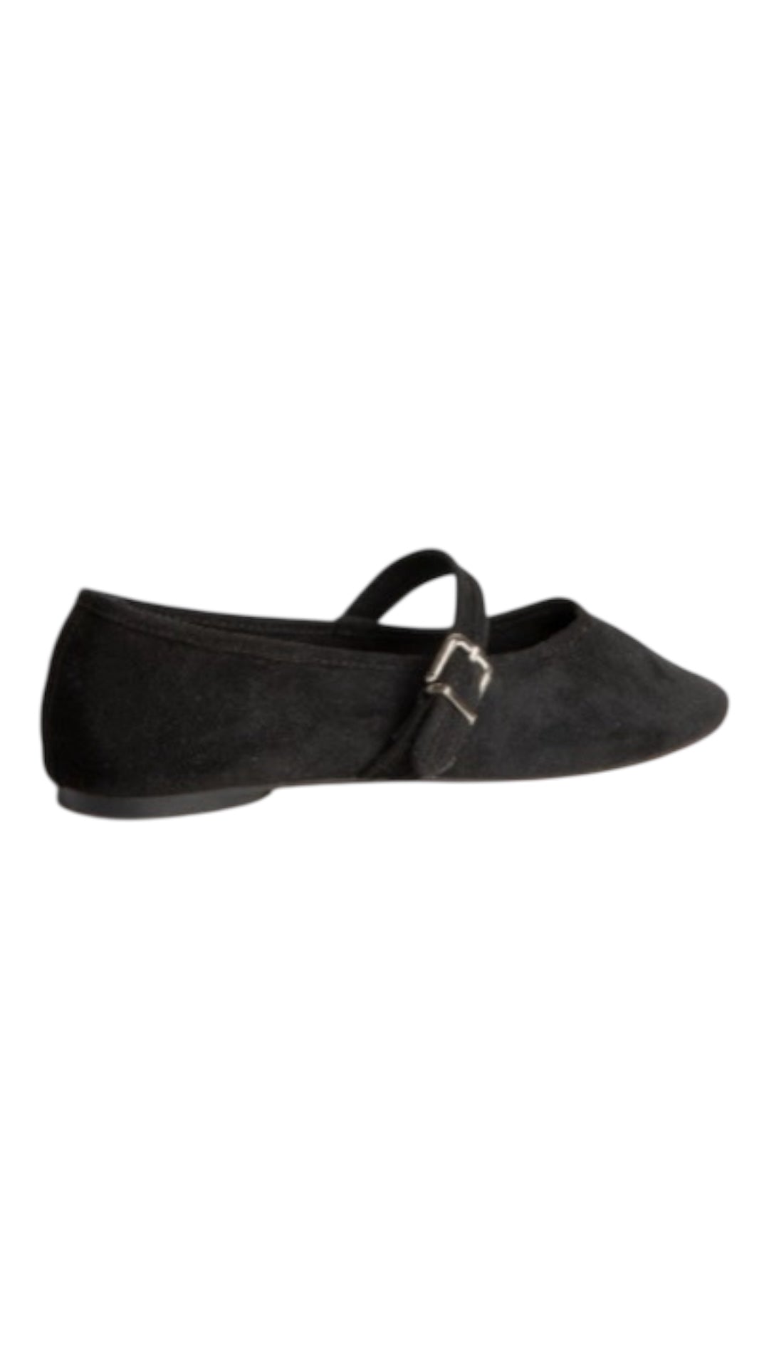 It's a black ballet flat with a pointed toe and a strap with a buckle closure. The fabric could be a synthetic material , You could wear those ballet flats in many places! They'd be great for a day at the office, a casual lunch with friends, or even a more dressed-up evening event. They're versatile and can be paired with various outfits.
