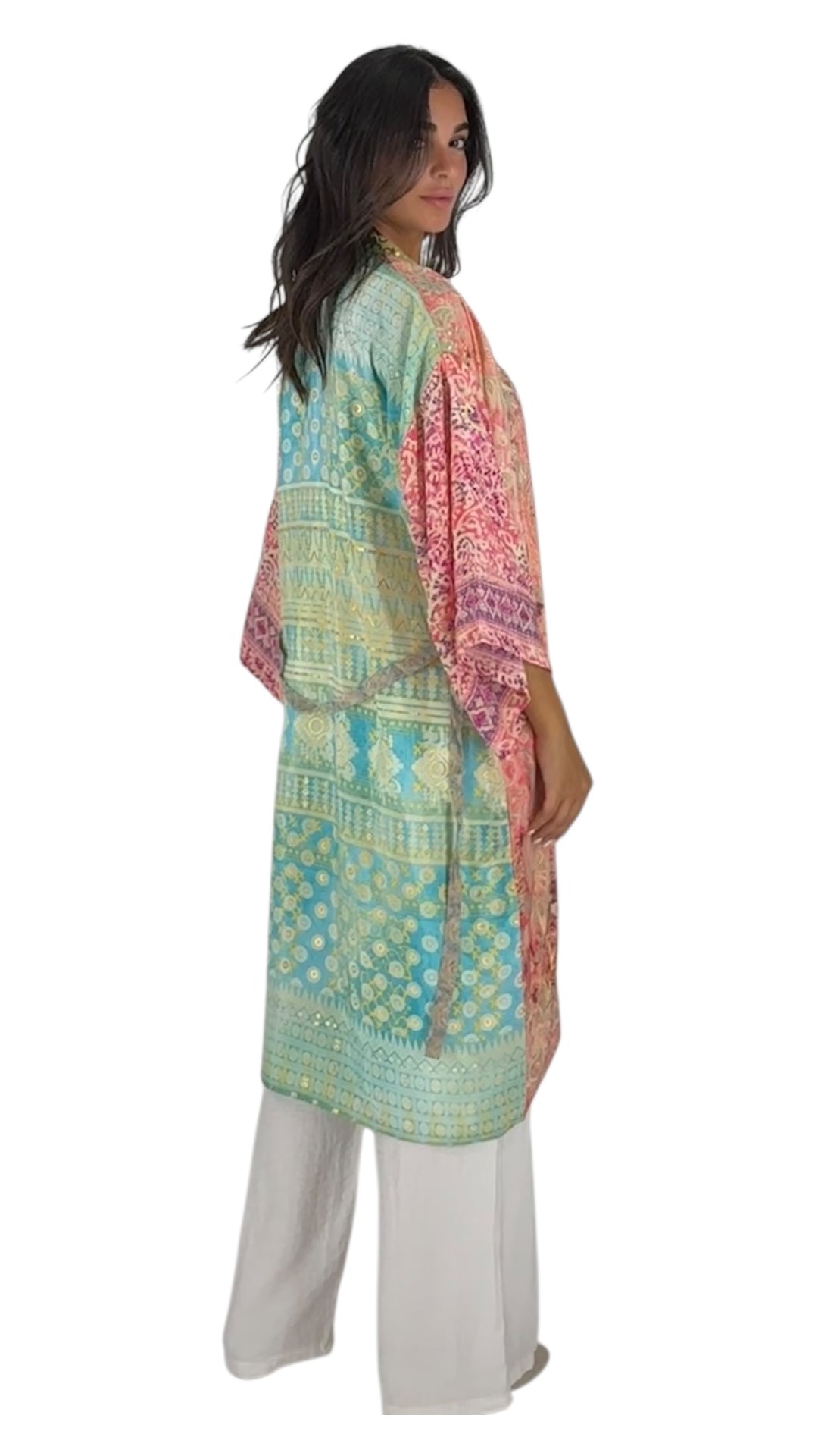 Elevate your wardrobe with this elegant kimono, designed with a flowing silhouette and intricate all-over patterns. Featuring wide sleeves and a relaxed open front, it offers both comfort and style for any occasion. The lightweight fabric makes it perfect for layering over casual outfits, beachwear, or evening ensembles. Its versatile design allows you to dress it up or down, making it a timeless piece in your collection.
