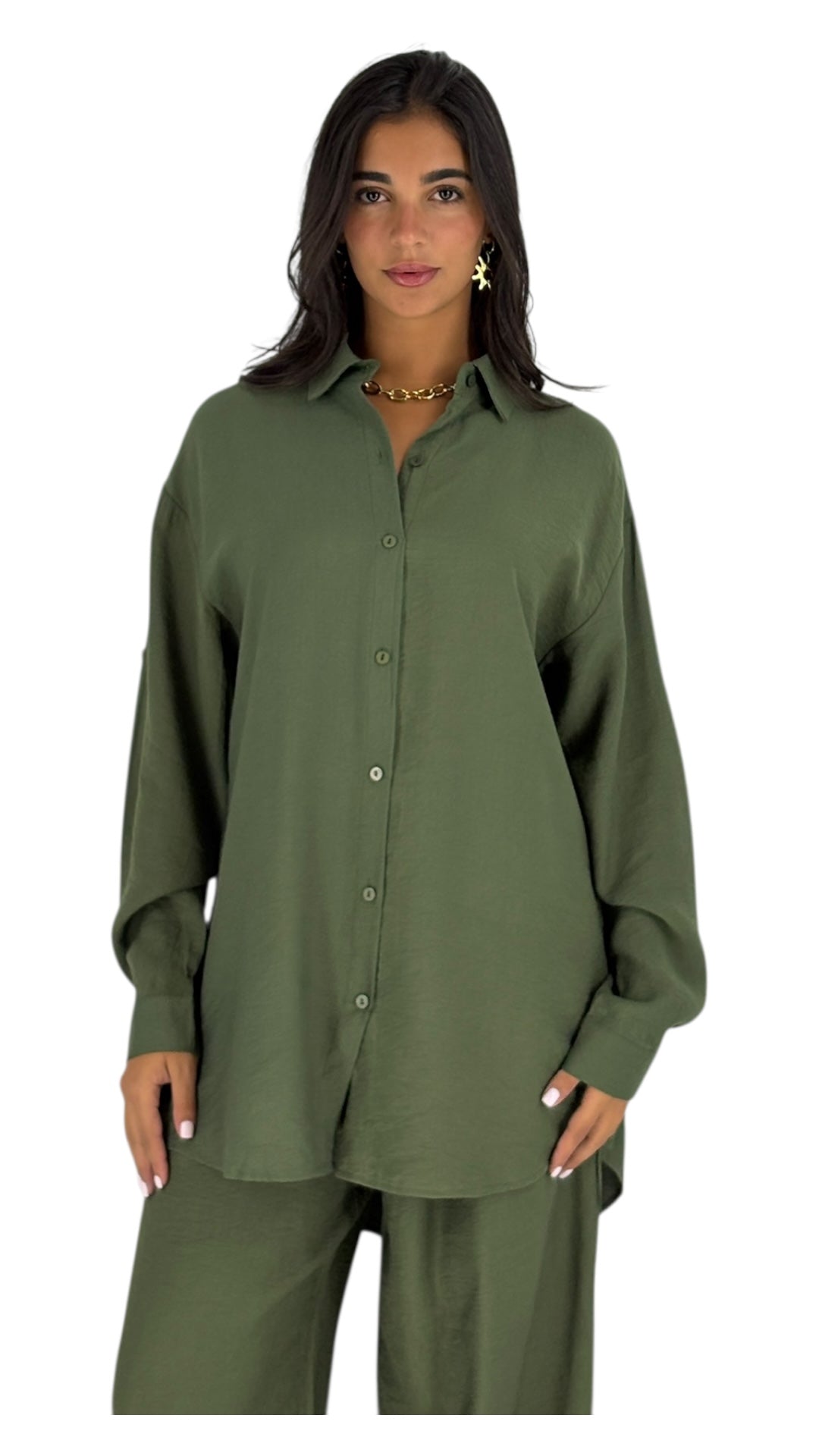 Step into effortless style with our collection of matching sets. Choose from a classic olive green ensemble featuring a button-down shirt and pants, perfect for a polished look. Or, opt for the contemporary green set with a button-down and wide-leg pants, offering both comfort and chic appeal. Crafted from high-quality fabrics, these sets are designed to elevate your wardrobe and provide versatile options for any occasion.