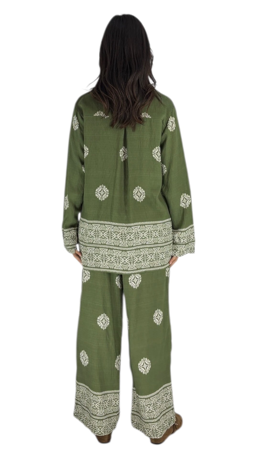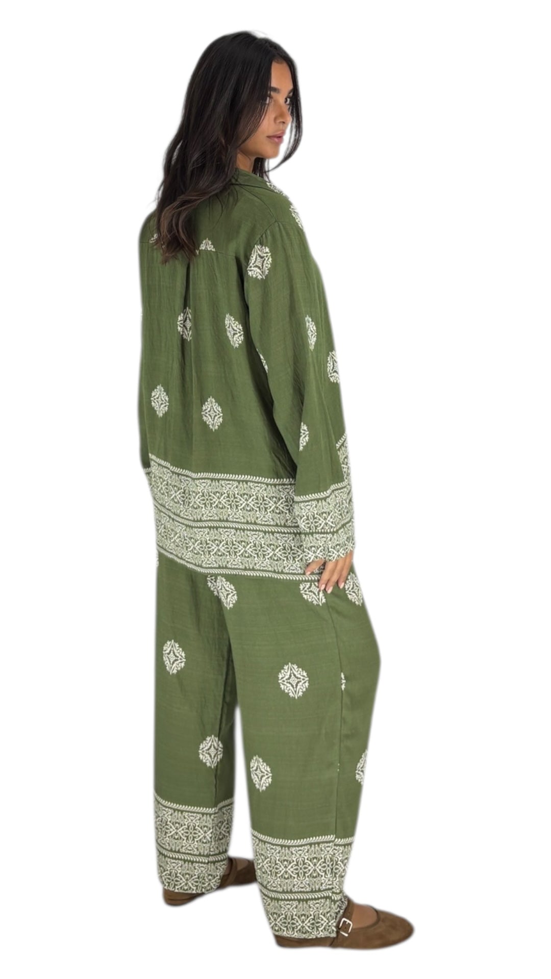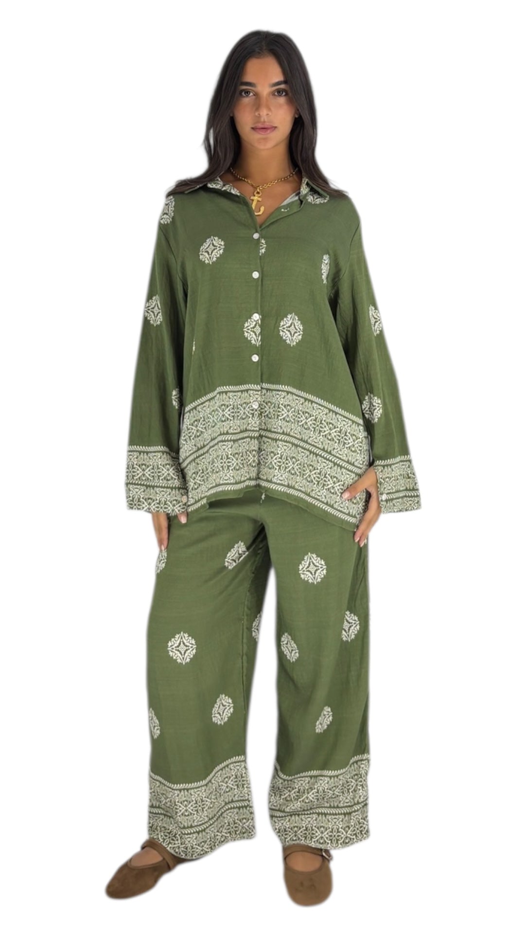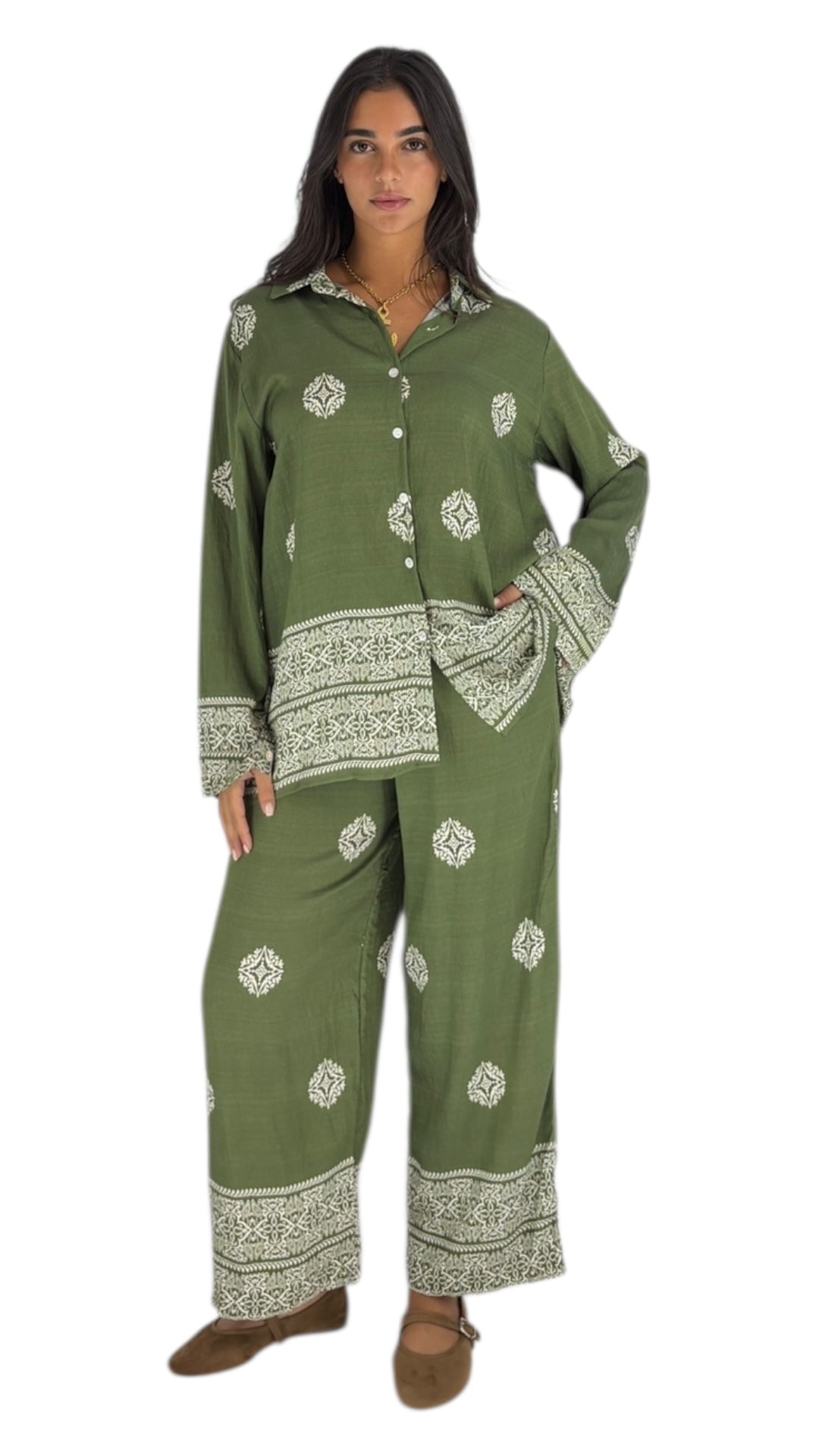 This set features a long-sleeved button-down shirt and wide-leg pants in a vibrant green hue, both adorned with a white pattern. The matching pieces create a cohesive and stylish look, while the wide-leg pants and button-down shirt offer a comfortable and chic vibe.