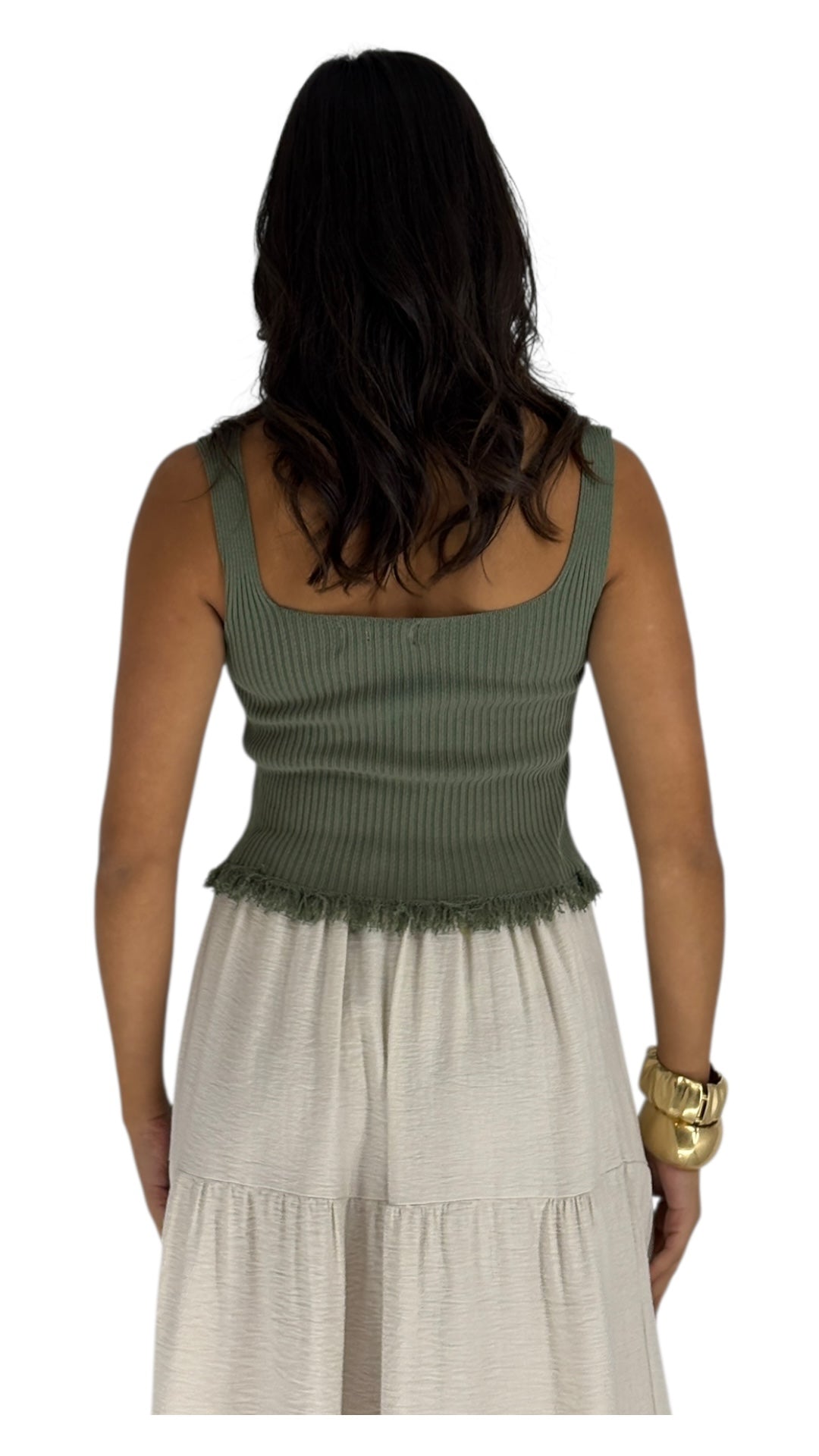 Introducing our green ribbed tank top with a stylish fringe at the bottom. This top is a perfect blend of comfort and chic design. The ribbed texture adds a touch of sophistication, while the fringe detail brings a playful, modern twist. Made from a soft, breathable fabric, it's perfect for any casual occasion. Pair it with your favorite bottoms for a trendy, effortless look!