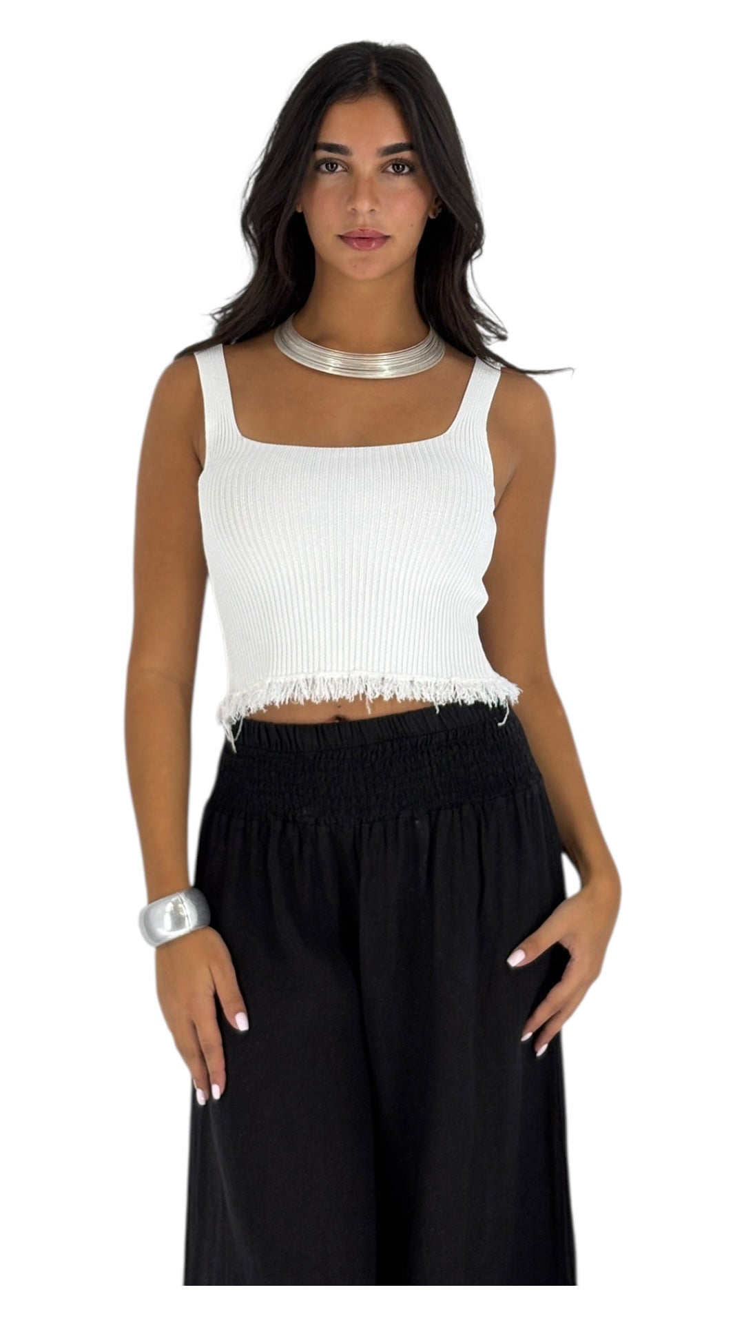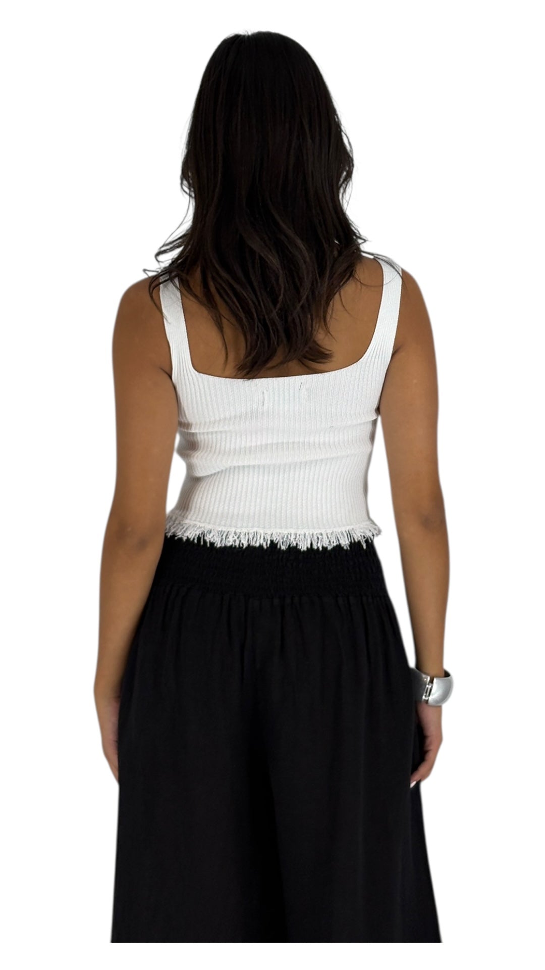Introducing our white ribbed tank top with a stylish fringe at the bottom. This top is a perfect blend of comfort and chic design. The ribbed texture adds a touch of sophistication, while the fringe detail brings a playful, modern twist. Made from a soft, breathable fabric, it's perfect for any casual occasion. Pair it with your favorite bottoms for a trendy, effortless look!