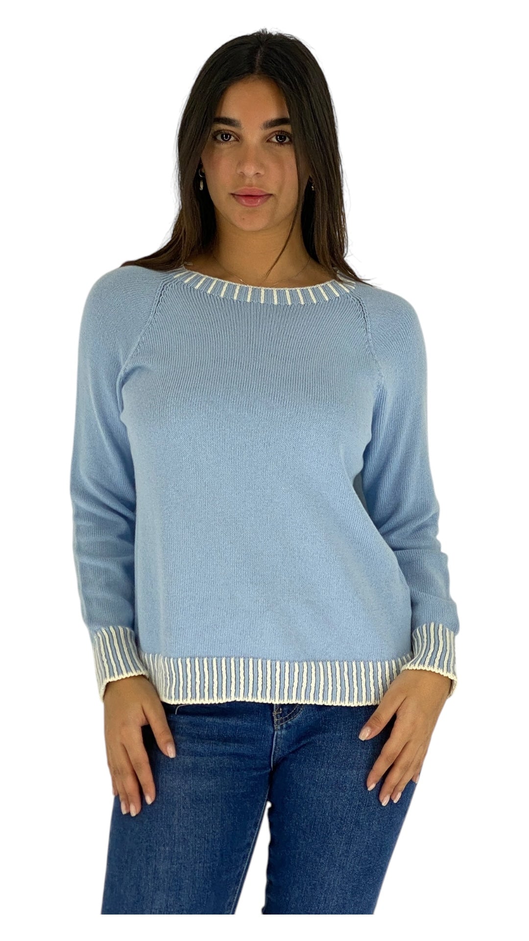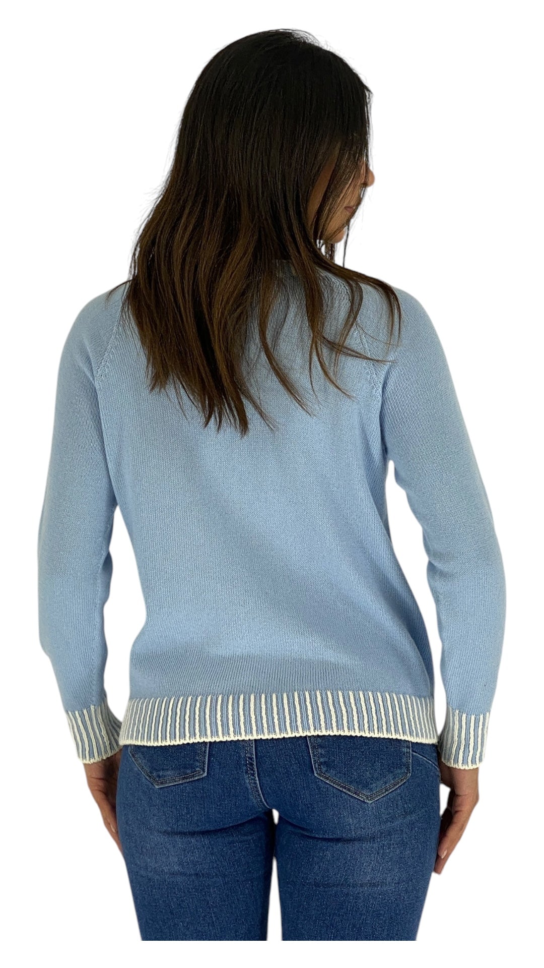 This zoya sweater is beautifully crafted with a fine stitch, giving it a soft and cozy texture. It features a stylish white trim around the neckline, cuffs, and hem, adding a nice contrast that elevates the overall look. The sweater is perfect for layering or wearing on its own, making it a versatile piece for any casual outfit.